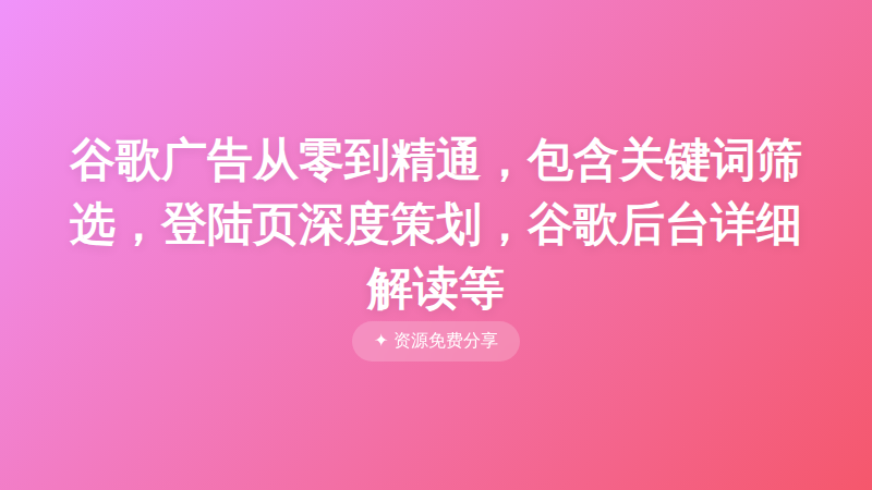 谷歌广告从零到精通,包含关键词筛选,登陆页深度策划,谷歌后台详细解读等 ├── 01_1-Leizi-谷歌广告从零到高阶 .mp4 ├── 02_2-关键词的搜索意图深度分析 .mp4 ├── 03_3-为什么谷歌可以验证用户的搜索意图 .mp4 ├── 04_4-如何查看你的关键词具体月搜索量--Keywordseverywhere-最全功能解读 .mp4 ├── 05_5-搜索量多少的关键词适合用来打广告 .mp4 ├── 06_6-关键词的商业价值深度分析 .mp4 ├── 07_7关键词点击成本多少适合打谷歌广告 .mp4 ├── 08_8-零售属性大宗产品广告解决方案 .mp4 ├── 09_9-零售属性,高客单价产品广告解决方案 .mp4 ├── 10_10-工业属性,半零售产品广告解决方案 .mp4 ├── 11_11-纯工业属性的产品-谷歌广告解决方案 .mp4 ├── 12_12-用户的转化流程-深度分析 .mp4 ├── 13_13-高转化率广告的底层逻辑 .mp4 ├── 14_14-关键词的分类底层逻辑 .mp4 ├── 15_15-关键词的筛选-分组指南 .mp4 ├── 16_16-谷歌搜索广告结构分析 .mp4 ├── 17_17-登录页转化归因深度分析 .mp4 ├── 18_18-登陆页的策划与布局 .mp4 ├── 19_19-登录页体验的分析与测试 .mp4 ├── 20_20-关键词的匹配形式 .mp4 ├── 21_21-广告账户-系列,广告组,关键词的逻辑关系 .mp4 ├── 22_22-否定关键词深度讲解 .mp4 ├── 23_23-什么是质量得分以及影响因素 .mp4 ├── 24_24-什么是广告的出价 .mp4 ├── 25_25-广告的排名规则分析 .mp4 ├── 26_26-广告后台全面预览-之-顶部导航栏 .mp4 ├── 27_27-广告后台全面预览-之-侧边导航栏 .mp4 ├── 28_28-如何找谷歌广告的官方客服解决问题 .mp4 ├── 29_29-如何处理谷歌后台的优化得分提升建议 .mp4 ├── 30_30-如何关闭自动采纳推荐广告的功能 .mp4 ├── 31_31-谷歌广告后台语言的设置 .mp4 ├── 32_32-谷歌广告的几种类型 .mp4 ├── 33_33-注册你的第一个谷歌广告账户 .mp4 ├── 34_34-如何建立你的第一个广告系列 .mp4 ├── 35_35-账户级别通用否定关键词列表的建立 .mp4 ├── 36_36-广告系列级别的否定关键词列表的建立 .mp4 ├── 37_37-广告附加信息汇总 .mp4 ├── 38_38-如何添加附加链接 .mp4 ├── 39_39-如何添加附加宣传信息 .mp4 ├── 40_40-如何添加附加结构化信息 .mp4 ├── 41_41-如何添加图片到广告 .mp4 ├── 42_42-如何添加附加电话 .mp4 ├── 43_43-如何添加附加表单 .mp4 ├── 44_44-如何预览你的广告展示效果 .mp4 ├── 45_45-“列”-的设置与数据分析 .mp4 ├── 46_46-如何更改已发布的广告系列设置 .mp4 ├── 47_47-二级细分纬度的分析与优化 .mp4 ├── 48_48-网站Thank-you-转化页面的设置 .mp4 ├── 49_49-谷歌分析工具的安装,转化的设置,谷歌广告的关联 .mp4 ├── 50_50-如何导入并关联谷歌分析工具与谷歌广告 .mp4 ├── 51_51--如何优化谷歌广告投放时间 .mp4 ├── 52_52---如何优化设备类型 .mp4 ├── 53_53-如何优化地理位置 .mp4 ├── 54_54-如何提升广告的点击率 .mp4 ├── 55_55-如何有效提升质量得分 .mp4 ├── 56_56-如何提升着陆页体验,-如何降低跳出率 .mp4 ├── 57_57-如何提升广告相关性得分 .mp4 ├── 59_59-如何授权账户给其他人查看你的账户 .mp4 ├── 60_60-如何正确看待优化得分 .mp4 ├── 61_61-质量得分越高,广告效果越好吗 .mp4 ├── 62_62-什么情况下考虑停掉某一个关键词? .mp4 ├── 63_63-点击率明明很高,预期点击率依然低于平均值怎么办? .mp4 ├── 64_64-展示广告的底层逻辑 .mp4 ├── 65_65-展示广告的种类 .mp4 ├── 66_66-展示广告的受众群体 .mp4 ├── 67_67--什么是再营销 .mp4 ├── 68_68-如何在谷歌分析后台开启再营销 .mp4 ├── 69_69-如何创建各种再营销列表 .mp4 ├── 70_70-如何添加自定义细分受众群体 .mp4 ├── 71_71--如何新建智能展示广告 .mp4 ├── 72_72-如何设置标准的展示广告 .mp4 ├── 73_73-如何设置发现广告系列 .mp4 ├── 74_74-如何设置效果最大化广告? .mp4 ├── 75_75-智能展示广告,标准展示广告,发现广告对比 .mp4 └── 76_76-搜索广告人工出价与争取转化次数出价的数据对比 .mp4