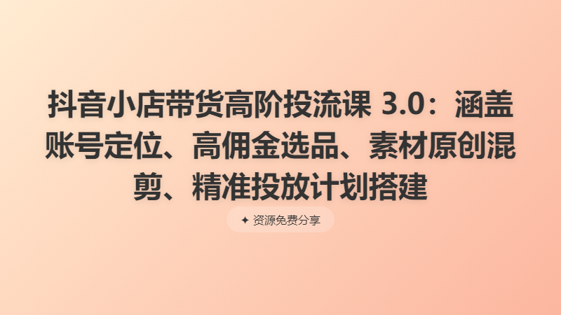 抖音小店带货高阶投流课 3.0:涵盖账号定位、高佣金选品、素材原创混剪、精准投放计划搭建