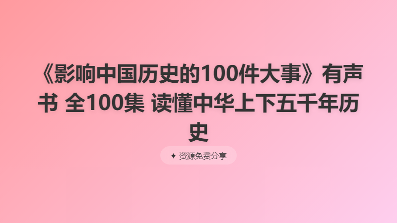 《影响中国历史的100件大事》有声书 全100集 读懂中华上下五千年历史[m4a] ├── 001.历史大事100件001-黄帝战蚩尤-华夏族的形成.m4a ├── 002.历史大事100件002-尧舜禅让-一个时代的更替.m4a ├── 003.历史大事100件003-夏朝建立-奴隶制度的由来.m4a ├── 004.历史大事100件004-商汤灭夏-顺应民意的举措.m4a ├── 005.历史大事100件005-武王伐纣-民心所向商王朝从此土崩瓦解.m4a ├── 006.历史大事100件006-春秋五霸-一个多姿多彩的时代.m4a ├── 007.历史大事100件007-孔子创儒学-流传于后世的经典学说.m4a ├── 008.历史大事100件008-三家分晋-中国封建社会的起点.m4a ├── 009.历史大事100件009-百家争鸣-一场关于学术的探讨.m4a ├── 010.历史大事100件010-战国争雄-轰轰烈烈的争霸之战.m4a ├── 011.历史大事100件011-商鞅变法-为秦王朝开辟帝业.m4a ├── 012.历史大事100件012秦始皇统一中国-第一个中央集权的封建国家.m4a ├── 013.历史大事100件013-焚书坑儒-中国文化的一场大浩劫.m4a ├── 014.历史大事100件014-陈胜吴广起义-王侯将相宁有种乎.m4a ├── 015.历史大事100件015-楚汉之争-刘邦VS项羽,谁更有领导力.m4a ├── 016.历史大事100件016-文景之治-汉朝的太平盛世.m4a ├── 017.历史大事100件017-汉武帝抗击匈奴-旷日持久终胜利.m4a ├── 018.历史大事100件018-罢黜百家独尊儒术-封建社会的正统思想.m4a ├── 019.历史大事100件019-张骞出使西域-丝绸之路的开辟.m4a ├── 020.历史大事100件020-司马迁著《史记》-史家之绝唱,无韵之离骚.m4a ├── 021.历史大事100件021-佛法东渐-沐浴佛法的智慧之光.m4a ├── 022.历史大事100件022-王莽改制-带着美好愿望开场,以失败告终.m4a ├── 023.历史大事100件023-东汉外戚宦官专权-东汉在腐败中灭亡.m4a ├── 024.历史大事100件024-黄巾起义-三国割据的前奏.m4a ├── 025.历史大事100件025-三国鼎立-乱世英雄起四方.m4a ├── 026.历史大事100件026-赤壁之战-三国名将的巅峰之战.m4a ├── 027.历史大事100件027-三分归晋-三国割据的结束.m4a ├── 028.历史大事100件028-苻坚统一北方-少数民族第一次统一中原.m4a ├── 029.历史大事100件029-淝水之战-以弱胜强的经典案例.m4a ├── 030.历史大事100件030-孝文帝改革-北魏的汉化运动.m4a ├── 031.历史大事100件031-隋文帝统一中国-融合南北文化的统一国家.m4a ├── 032.历史大事100件032-科举制度的创立-揭开选官制度的新篇章.m4a ├── 033.历史大事100件033-隋朝大运河的开通-古代南北水路交通大动脉.m4a ├── 034.历史大事100件034-隋灭与唐兴-朝代更替中的盛与衰.m4a ├── 035.历史大事100件035-贞观之治-盛世大唐的辉煌篇章.m4a ├── 036.历史大事100件036-文成公主入藏-汉藏友好的使者.m4a ├── 037.历史大事100件037-玄奘西行-为求真经不畏艰难险阻.m4a ├── 038.历史大事100件038-一代女皇武则天-政启开元,治宏贞观.m4a ├── 039.历史大事100件039-开元盛世-盛极而衰的转折点.m4a ├── 040.历史大事100件040-安史之乱-从繁荣走向灾难.m4a ├── 041.历史大事100件041-李白和杜甫-诗歌创作最强二人组.m4a ├── 042.历史大事100件042-藩镇割据-唐朝衰灭的重要原因.m4a ├── 043.历史大事100件043-黄巢起义-唐末空前壮烈的农民战争.m4a ├── 044.历史大事100件044-五代十国-中国再次陷入分裂.m4a ├── 045.历史大事100件045-陈桥兵变-北宋王朝的开端.m4a ├── 046.历史大事100件046-杯酒释兵权-和平收回权力的典范.m4a ├── 047.历史大事100件047-澶渊之盟-化干戈为玉帛.m4a ├── 048.历史大事100件048-王安石变法-力图打破积贫积弱的局面.m4a ├── 049.历史大事100件049-靖康之耻-汉民族历史上的浩劫.m4a ├── 050.历史大事100件050-岳飞抗金-精忠报国.m4a ├── 051.历史大事100件051-理学的形成-古代儒学的复兴.m4a ├── 052.历史大事100件052-中国四大发明-推动人类文明进程.m4a ├── 053.历史大事100件053-元朝大一统-开疆拓土,南征北战.m4a ├── 054.历史大事100件054-明朝的建立-汉族兴盛的时代.m4a ├── 055.历史大事100件055-靖难之役-扭转颓势的叔侄之战.m4a ├── 056.历史大事100件056-郑和下西洋-世界航海史上的壮举.m4a ├── 057.历史大事100件057-戚继光抗倭-给外来入侵者的有力打击.m4a ├── 058.历史大事100件058-首辅张居正改革-明朝最伟大的改革.m4a ├── 059.历史大事100件059-利玛窦来华-西方文化在中国传播.m4a ├── 060.历史大事100件060-李自成起义-农民翻身成闯王.m4a ├── 061.历史大事100件061-清朝的建立-奠定现代中国的版图.m4a ├── 062.历史大事100件062-郑成功收复台湾-名垂青史的功绩.m4a ├── 063.历史大事100件063-康乾盛世-没落王朝的最后辉煌.m4a ├── 064.历史大事100件064-清代文字狱-一个奇葩的存在.m4a ├── 065.历史大事100件065-雅克萨战争-英勇反抗侵略者的自卫战争.m4a ├── 066.历史大事100件066-虎门销烟-一场没有硝烟的战争.m4a ├── 067.历史大事100件067-中英鸦片战争-让中国社会巨变的一场殖民战争.m4a ├── 068.历史大事100件068-太平天国运动-反帝反封建的农民运动.m4a ├── 069.历史大事100件069-辛酉政变-一场争夺大权的角逐.m4a ├── 070.历史大事100件070-洋务运动-晚清中国的富国梦.m4a ├── 071.历史大事100件071-中日甲午战争-中日兴衰的分水岭