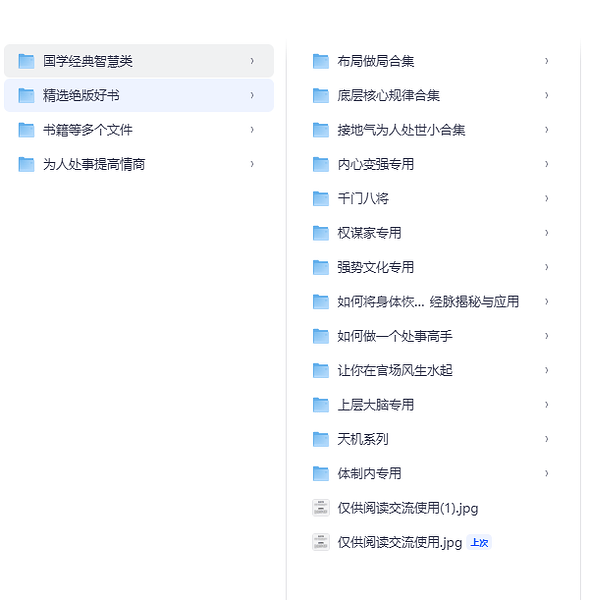 绝版书籍合集 ├── 精选绝版好书 │ ├── 接地气为人处世小合集 │ │ ├── 05《怎样不受气》(1).pdf │ │ ├── 10《怎样笼络人心》(1).pdf │ │ ├── 《怎样妙言善辩》(1).pdf │ │ ├── 《怎样对付小报告》(1).pdf │ │ ├── 04《小人研究》(1).pdf │ │ ├── 08《老狐狸经》(1).pdf │ │ ├── 01《怎样赞美别人》(1).pdf │ │ ├── 《怎样善解人意》(1).pdf │ │ ├── 《怎样变通协调》(1).pdf │ │ ├── 《怎样与男人相处》(1).pdf │ │ ├── 《怎样对付难缠的人》(1).pdf │ │ ├── 07《青年怎样适应社会》(1).pdf │ │ ├── 《怎样对付小人》(1).pdf │ │ ├── 03《寻访脸皮学院》(1).PDF │ │ ├── 06《老实人启蒙》(1).pdf │ │ ├── 《怎样与女人相处》(1).pdf │ │ ├── 《怎样轻松自如》(1).pdf │ │ ├── 09《马屁经》(1).pdf │ │ ├── 《怎样识别谎言》(1).pdf │ │ ├── 《怎样广结人缘》(1).pdf │ │ ├── 《怎样与领导相处》(1).pdf │ │ ├── 02《怎样和领导相处》(1).pdf │ │ └── 《怎样出人头地》(1).pdf │ ├── 体制内专用 │ │ ├── 《饭局办事指南》(1).pdf │ │ ├── 《老A回忆录》(1).pdf │ │ ├── 《机关的机关》(1).pdf │ │ ├── 《单位晋升教科书》(1).pdf │ │ ├── 《职场权谋手段》(1).pdf │ │ ├── 《单位生存教科书》(1).pdf │ │ ├── 饭局操控术 (1).pdf │ │ ├── 《提拔重用指南》(1).pdf │ │ └── 《体制内生存之道》(1).pdf │ ├── 强势文化专用 │ │ ├── 038《地之卷:红尘修炼手册》(1).pdf │ │ ├── 《天之卷:强者修炼手册》(1).pdf │ │ ├── 《杂之卷:强者思想语录》(1).pdf │ │ └── 《人之卷:人性修炼手册》(1).pdf │ ├── 让你在官场风生水起 │ │ ├── 《二号首长》上集(1).pdf │ │ ├── 豆豆三部曲3《天幕红尘》(1).pdf │ │ ├── 《二号首长》下集(1).pdf │ │ ├── 豆豆三部曲2《遥远的救世主》(1).pdf │ │ ├── 《二号首长》中集(1).pdf │ │ └── 豆豆三部曲1《背叛》(1).pdf │ ├── 天机系列 │ │ ├── 《天机19门》(1).pdf │ │ ├── 《天机处事14绝》(1).pdf │ │ ├── 《天机16悟道》(1).pdf │ │ ├── 《天机14意念》(1).pdf │ │ ├── 《天机19法度》(1).pdf │ │ ├── 《天机31意根》(1).pdf │ │ ├── 《天机38局》(1).pdf │ │ ├── 《天机26造业》(1).pdf │ │ ├── 《天机36诡术》(1).pdf │ │ ├── 《天机30觉醒》(1).pdf │ │ ├── 《天机26生慧》(1).pdf ... 省略 266 行 ... ├── 《人性真言》(1).pdf ├── 《人性要诀》(1).pdf ├── 《成长人性》(1).pdf ├── 《烂好人毒素》(1).pdf ├── 《阅人高手2》(1).pdf ├── 《人性社交思维手册》(1).pdf ├── 《人性商战(线下3天2夜全文字版)》(1).pdf ├── 《贪婪的人性》男人篇(1).pdf ├── 《开窍开智开悟5》(1).pdf ├── 《人性底层模型1.0》(1).pdf ├── 《开窍开悟开智1》(1).pdf ├── 《人性探索大师1》(1).pdf ├── 《万能识人术》(1).pdf ├── 《红尘纵横1》(1).pdf ├── 《人脑操控力》(1).pdf ├── 《人性探索大师2》(1).pdf ├── 《人性心法》(1).pdf ├── 《大心机2》(1).pdf ├── 《人性伎俩》(1).pdf ├── 《红尘纵横3》(1).pdf ├── 《坏人基因》下册(1).pdf ├── 《社会人心运作手册》PDF版(1).pdf ├── 《开悟开窍开智3》(1).pdf ├── 《人性智谋36计》(1).pdf ├── 《人性纵横说1.0》(1).pdf ├── 《高手深度思考的秘密》(1).pdf ├── 《大心机3》(1).pdf ├── 《揭秘男人的人性》(1).pdf ├── 《红尘纵横2》(1).pdf ├── 《人性成败拿捏》(1).pdf ├── 《红尘修炼手册》(1).pdf ├── 《坏人基因》上册(1).pdf ├── 《人性底层模型2.0》(1).pdf ├── 《洞察人性天机》(1).pdf ├── 《大心机1》(1).pdf ├── 《天之卷:强者修炼手册》(1).pdf ├── 《人性宝典2.0》(1).pdf ├── 001《绝密人性天书》净版(1).pdf ├── 《人心探索(动机篇)》(1).pdf ├── 《开窍开悟开智2》(1).pdf ├── 《富人机密手稿》(1).pdf ├── 《人心探索(操控篇)》(1).pdf ├── 《人性错觉控制术》(1).pdf ├── 《万能厚黑不黑模式》(1).pdf ├── 《人性背后隐藏的邪恶密码》(1).pdf ├── 《人性难题宝典1-9》(1).pdf ├── 《人性探索大师3》(1).pdf ├── 《怎样洞察人心》(1).pdf ├── 《百发百中攻心术》(1).pdf ├── 《冷读术》(1).pdf ├── 《玩转人性》(1).pdf ├── 《人性密码》(1).pdf ├── 《人性艺术-内心电影剪辑师》(1).pdf ├── 《驭心高手》(1).pdf ├── 《道破人性第一书》(1).pdf ├── 《人类欺骗行为解读》(1).pdf ├── 《火之卷:权谋修炼手册》(1).pdf ├── 《社会人心运作手册》(1).pdf ├── 《人性魔鬼手段》(1).pdf └── 《坏术大师》(1).pdf