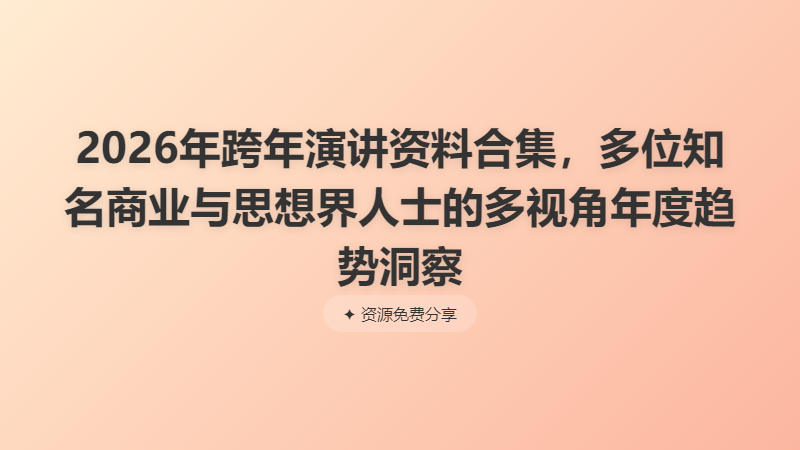 2026年跨年演讲资料合集 ├── 1-刘润跨年演讲(PPT+视频) │ ├── 刘润跨年演讲PPT │ │ ├── 1.大迁徙.pdf │ │ ├── 2.品类大迁徙.pdf │ │ ├── 3.价值大迁徙.pdf │ │ ├── 4.模式大迁徙.pdf │ │ ├── 5.出海大迁徙.pdf │ │ ├── 6.智能大迁徙.pdf │ │ ├── 7.人口大迁徙.pdf │ │ ├── 8.第四百万零一种活法.pdf │ │ └── 9.免责声明.pdf │ └── 刘润年度演讲.mp4 ├── 2-雷军跨年演讲(PPT+视频) │ ├── 雷军跨年演讲.mp4 │ └── 雷军跨年演讲.pdf ├── 3-香帅跨年演讲(视频) │ └── 香帅年度演讲.mp4 ├── 4-吴声跨年演讲(视频) │ └── 吴声演讲视频.mp4 ├── 5-吴晓波跨年演讲(PPT+视频) │ ├── 吴晓波演讲PPT-上半场.pdf │ ├── 吴晓波演讲PPT-下半场.pdf │ └── 吴晓波演讲视频.mp4 ├── 6-崔璀跨年演讲(视频) │ └── 崔璀演讲视频.mp4 └── 7-罗振宇跨年演讲(视频+PPT) ├── 罗振宇2026跨年演讲完整版PPT.pdf └── 罗振宇演讲视频.mp4