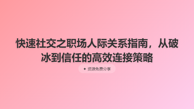 快速社交之职场人际关系指南,从破冰到信任的高效连接策略 ├── 1.1职场需要“搞关系”嘛?(一).mp4 ├── 1.2职场需要“搞关系”嘛?(二).mp4 ├── 2.1社交高手具备哪些特质(一).mp4 ├── 2.2社交高手具备哪些特质(二).mp4 ├── 3.1确定你的职场定位(一).mp4 ├── 3.2确定你的职场定位(二).mp4 ├── 4.1理清你的职场关系(一).mp4 ├── 4.2理清你的职场关系(二).mp4 ├── 5.1调整你的职场角色(一).mp4 ├── 5.2调整你的职场角色(二).mp4 ├── 5.3调整你的职场角色(三).mp4 ├── 6.1梳理职场人脉资源(一).mp4 ├── 6.2梳理职场人脉资源(二).mp4 ├── 7.1拉近人际关系距离(一).mp4 ├── 7.2拉近人际关系距离(二).mp4 ├── 7.3拉近人际关系距离(三).mp4 ├── 8.1提升职场沟通能力(一).mp4 ├── 8.2提升职场沟通能力(二).mp4 ├── 8.3提升职场沟通能力(三).mp4 ├── 9.1拉近人际关系距离(一).mp4 ├── 9.2拉近人际关系距离(二).mp4 ├── 9.3拉近人际关系距离(三).mp4 ├── 10.1适时展现职场优势(一).mp4 ├── 10.2适时展现职场优势(二).mp4 ├── 10.3适时展现职场优势(三).mp4 ├── 11.1升级职场人际思维(一).mp4 ├── 11.2升级职场人际思维(二).mp4 ├── 12.1识别人际关系陷阱(一).mp4 ├── 12.2识别人际关系陷阱(二).mp4 ├── 12.3识别人际关系陷阱(三).mp4 ├── 13.1职场关系排雷指南(一).mp4 ├── 13.2职场关系排雷指南(二).mp4 ├── 13.3职场关系排雷指南(三).mp4 ├── 14.1职场关系修炼法则(一).mp4 ├── 14.2职场关系修炼法则(二).mp4 └── 14.3职场关系修炼法则(三).mp4