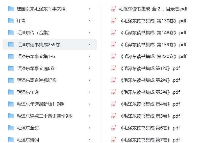 毛泽东著作大全(400本)29G ├── 建国以来毛泽东军事文稿 │ ├── 建国以来毛泽东军事文稿 上卷.pdf │ ├── 建国以来毛泽东军事文稿 下卷.pdf │ └── 建国以来毛泽东军事文稿 中卷.pdf ├── 江青 │ ├── 江青传(上).pdf │ ├── 江青传(下).pdf │ ├── 江青全传.pdf │ ├── 江青正传.pdf │ └── 四人帮兴亡(增订版)(套装共4册).epub ├── 毛泽东传(合集) │ ├── 胡乔木回忆毛泽东.pdf │ ├── 毛泽东传-罗斯·特里尔.pdf │ ├── 毛泽东传1893-1949.pdf │ ├── 毛泽东传(1).pdf │ ├── 毛泽东传(2).pdf │ ├── 毛泽东传(3).pdf │ ├── 毛泽东传(4).pdf │ ├── 毛泽东传(5).pdf │ ├── 毛泽东传(6).pdf │ ├── 毛泽东传:名著珍藏版(插图本) (罗斯·特里尔 (Ross Terrill)).pdf │ ├── 毛泽东饮食趣谈 吴连登.pdf │ ├── 毛泽东自传.pdf │ ├── 西行漫记(红星照耀中国).pdf │ ├── 中国的共产主义与毛泽东的崛起(插图本) ([美]本杰明-史华慈).pdf │ ├── 治国录 毛泽东与1949年后的中国1.pdf │ └── 治国录 毛泽东与1949年后的中国2.pdf ├── 毛泽东读书集成259卷 │ ├── 毛泽东读书集成-全 259卷16开精装含目录卷.pdf │ ├── 《毛泽东读书集成 第130卷》.pdf │ ├── 《毛泽东读书集成 第148卷》.pdf │ ├── 《毛泽东读书集成 第159卷》.pdf │ ├── 《毛泽东读书集成 第220卷》.pdf │ ├── 《毛泽东读书集成 第1卷》.pdf │ ├── 《毛泽东读书集成 第2卷》.pdf │ ├── 《毛泽东读书集成 第3卷》.pdf │ ├── 《毛泽东读书集成 第4卷》.pdf │ ├── 《毛泽东读书集成 第5卷》.pdf │ ├── 《毛泽东读书集成 第6卷》.pdf │ ├── 《毛泽东读书集成 第7卷》.pdf │ ├── 《毛泽东读书集成 第8卷》.pdf │ ├── 《毛泽东读书集成 第9卷》.pdf │ ├── 《毛泽东读书集成 第10卷》.pdf │ ├── 《毛泽东读书集成 第11卷》.pdf │ ├── 《毛泽东读书集成 第12卷》.pdf │ ├── 《毛泽东读书集成 第13卷》.pdf │ ├── 《毛泽东读书集成 第14卷》.pdf │ ├── 《毛泽东读书集成 第15卷》.pdf │ ├── 《毛泽东读书集成 第16卷》.pdf │ ├── 《毛泽东读书集成 第17卷》.pdf │ ├── 《毛泽东读书集成 第18卷》.pdf │ ├── 《毛泽东读书集成 第19卷》.pdf │ ├── 《毛泽东读书集成 第21卷》.pdf │ ├── 《毛泽东读书集成 第22卷》.pdf │ ├── 《毛泽东读书集成 第23卷》.pdf │ ├── 《毛泽东读书集成 第24卷》.pdf │ ├── 《毛泽东读书集成 第25卷》.pdf │ ├── 《毛泽东读书集成 第26卷》.pdf │ ├── 《毛泽东读书集成 第27卷》.pdf ... 省略 284 行 ... │ ├── 在毛泽东身边十五年.pdf │ ├── 再思毛泽东.pdf │ └── 《毛主席语录》.pdf ├── 毛泽东选集 │ └── 毛选1-4卷.pdf ├── 毛泽东哲学相关著作 │ └── 《毛泽东哲学批注集》及导论 │ ├── 毛泽东哲学批注集 (中共中央文献研究室).pdf │ ├── 毛泽东哲学批注集:辩证法唯物论教程批注.pdf │ └── 《毛泽东哲学批注集》导论 (石仲泉编写).pdf ├── 毛泽东主席照片选集(人民美术出版社1977) │ ├── 毛泽东主席照片选集(人民美术出版社1977).pdf │ ├── 毛主席1.jpg │ └── 毛主席2.jpg ├── 毛泽东在延安丛书16卷 │ ├── 毛泽东在延安丛书: 延安时期毛泽东经济思想 董志凯 毛立言 武力著1993-.pdf │ ├── 毛泽东在延安丛书:毛泽东和延安时代 黄士安 赵广 王延湜主编1993-.pdf │ ├── 毛泽东在延安丛书:毛泽东及其战友与延安时期青年运动 郑洸编1993-.pdf │ ├── 毛泽东在延安丛书:毛泽东是延安精神的缔造者 罗忠敏 崔岩主编1993-.pdf │ ├── 毛泽东在延安丛书:毛泽东与延安时期精兵简政 刘益涛主编1993-.pdf │ ├── 毛泽东在延安丛书:毛泽东在延安纪事 刘益涛编1994-.pdf │ ├── 毛泽东在延安丛书:延安时期毛泽东建党思想 范平 姚桓主编1993-.pdf │ ├── 毛泽东在延安丛书:延安时期毛泽东领导方法 宋柏主编1993-.pdf │ ├── 毛泽东在延安丛书:延安时期毛泽东思想政治教育理论与实践 席文启编1993-.pdf │ ├── 毛泽东在延安丛书:延安时期毛泽东统战思想 韩泰华 牛桂云 刘宋斌著1993-.pdf │ ├── 毛泽东在延安丛书:延安时期毛泽东文化思想 谢荫明主编1993-.pdf │ ├── 毛泽东在延安丛书:延安时期毛泽东外交战略 1943-1949 刘德喜著1993-.pdf │ ├── 毛泽东在延安丛书:延安时期毛泽东文艺思想 余飘著1993-.pdf │ ├── 毛泽东在延安丛书:延安时期毛泽东著述提要 1935-1948 萧少秋主编1993-.pdf │ ├── 毛泽东在延安丛书:延安时期毛泽东哲学思想 曾宪新 刘金田 郑昭红著1993-.pdf │ └── 毛泽东在延安丛书:延安时期毛泽东政治思想 高智瑜主编1994-.pdf ├── 毛泽东著作专题摘编 │ ├── 毛泽东著作专题摘编 上.pdf │ └── 毛泽东著作专题摘编 下.pdf ├── 毛主席哲学著作学习文件汇编 │ ├── 毛主席哲学著作学习文件汇编下.pdf │ └── 毛主席哲学著作学习文件汇编中.pdf ├── 《建国以来毛泽东文稿 共20卷》最新版 │ ├── 《建国以来毛泽东文稿》 第1册 (1949年9月-1950年2月).pdf │ ├── 《建国以来毛泽东文稿》 第2册 (1950年3月-1950年8月).pdf │ ├─