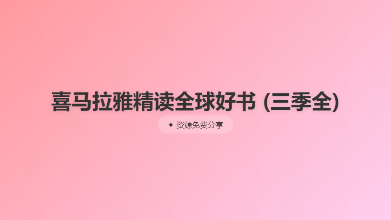 喜马拉雅精读全球好书(三季全)【12.8GB】 ├── 精读全球好书100本【第一季】 │ ├── 第1季 001-050 │ │ ├── 001.《小炸弹联盟》.wma │ │ ├── 002.《北方海域》.wma │ │ ├── 003.《地下铁道》.wma │ │ ├── 004.《素食主义者》.wma │ │ ├── 005.《战争与松脂》.wma │ │ ├── 006-1.《在存在主义咖啡馆(上)》.wma │ │ ├── 006-2.《在存在主义咖啡馆(下)》.wma │ │ ├── 007-1.《黑金政治(上)》.wma │ │ ├── 007-2.《黑金政治(下)》.wma │ │ ├── 008.《被驱逐者》.wma │ │ ├── 009.《在暗室中》.wma │ │ ├── 010.《归去:父亲、儿子和他们的土地》.wma │ │ ├── 011.《乡下人的悲歌》.wma │ │ ├── 012.《当呼吸化为空气》.wma │ │ ├── 013.《双生梦魇》.wma │ │ ├── 014.《南瓜花》.wma │ │ ├── 015.《坠机之前》.wma │ │ ├── 016.《莫斯科的绅士》.wma │ │ ├── 017.《女孩与性》.wma │ │ ├── 018.《基因》.wma │ │ ├── 019.《小而伟大的事》.wma │ │ ├── 020.《实验室女孩》.wma │ │ ├── 022-1.《罪与罚(上)》.wma │ │ ├── 022-2.《罪与罚(下)》.wma │ │ ├── 023.《百年孤独》.wma │ │ ├── 025-1.《不能承受的生命之轻(上)》.wma │ │ ├── 025-2.《不能承受的生命之轻(下)》.wma │ │ ├── 026.《追风筝的人》.wma │ │ ├── 027.《洛丽塔》.wma │ │ ├── 028.《第二十二条军规》.wma │ │ ├── 029.《情人》.wma │ │ ├── 030.《1984》.wma │ │ ├── 031-1.《旧制度与大革命(上)》.wma │ │ ├── 031-2.《旧制度与大革命(下)》.wma │ │ ├── 032.《物种起源》.wma │ │ ├── 033.《第二性》.wma │ │ ├── 034.《枪炮、细菌与钢铁》.wma │ │ ├── 035.《崩溃:社会如何选择成败兴亡》.wma │ │ ├── 036.《失控》.wma │ │ ├── 037.《语言本能》.wma │ │ ├── 038.《自私的基因》.wma │ │ ├── 039.《时间简史》.wma │ │ ├── 040.《众病之王:癌症传》.wma │ │ ├── 041.《拆掉思维里的墙》.wma │ │ ├── 042.《人类简史:从动物到上帝》.wma │ │ ├── 043.《植物知道生命的答案》.wma │ │ ├── 044.《怪诞行为学》.wma │ │ ├── 045.《娱乐至死》.wma │ │ ├── 046.《黑天鹅》.wma │ │ ├── 047.《乌合之众》.wma │ │ ├── 048.《黑洞与时间弯曲》.wma │ │ ├── 049.《哲学家们都干了些什么?》.wma │ │ └── 050.《聪明人的心理学》.wma │ └── 第1季 051-100 │ ├── 051.《自控力》.wma │ ├── 052.《非暴力沟通》.wma │ ├── 053.《男人来自火星,女人来自金星》.wma ... 省略 324 行 ... │ ├── 77《斯通纳》:即使不能拥有完美的生活,所幸追求过完整的自我.wma │ ├── 78《不对称》:差异和不公,才是这个世界的常态.wma │ ├── 79《伟大的孤独》:与世隔绝的阿拉斯加,让越战老兵变成了冷血的禽兽.wma │ ├── 80《麦克白》:莎士比亚四大悲剧之一:人,为何总是成于野心,败于野心.wma │ ├── 81《幸福之路》:不幸的原因和幸福的原因,都在罗素大师的这本书里了.wma │ └── 82《我的简史:霍金自传》:被禁锢在轮椅上的巨人讲述属于自己的小宇宙.wma └── 第3季 051-100 ├── 083《低欲望社会》:不婚不育不买房,日本年轻人为何这么“丧”.wma ├── 084《情绪急救》:人人都需要的心理药箱,治疗七种常见情绪创伤.wma ├── 085《奈飞文化手册》:“硅谷重要文件”深度解读,揭示流媒体巨头的用人秘诀.wma ├── 086《告白》震撼全日本的社会派推理小说,揭露人心的孤独与罪恶.wma ├── 087《忠犬八公》:比生命更悠长的,是忠诚的爱.wma ├── 088《伟大的信徒》:世上最悲伤的事并非憎恨,而是爱的失败.wma ├── 089《奥斯维辛的纹身师》:在人类史上最悲催的浩劫中求生,令人心碎的爱情物语.wma ├── 090《我是猫》:愚蠢的人类啊,喵.wma ├── 091《沉思录》:古罗马哲学家皇帝的心灵对话录,人类最伟大的智慧结晶之一 唯一.wma ├── 092《麦当劳之父的商业冒险》:“快餐大王”自传,成功永远都不晚.wma ├── 093《人工智能会抢哪些工作》:那些权威专家,也要被机器抢了饭碗吗.wma ├── 094《取悦症》:对别人有求必应?这是“病”,得治.wma ├── 095《宜家故事》:从邮购公司到家居巨头,是什么让IKEA风靡全球.wma ├── 096《24个比利(上)》:多重人格分裂,心理纪实的典范,小李子为之等待20年 唯一.wma ├── 097《24个比利(下)》:因为找不到完整的自我,他将永远活在破碎的世界里.wma ├── 098《十一种孤独》:焦虑时代的伟大作家,讲述个体和时代灵魂深处的孤独.wma ├── 099《弗雷德里克·道格拉斯》:了解美国历史上第一位黑人领袖的故事.wma ├── 100《线流成河》:美国亚马逊年度好书,美墨边境线上的生与死.wma ├── 101《死魂灵》:穷人千篇一律,富人千姿百态.wma ├── 102《追寻生命的意义》:无论在任何情况下,人都有最后选择自己态度的自由.wma ├── 103《一胜九败》:优衣库为何能风靡全球?犯错越多,离成功越近.wma ├── 104《叔本华传》(上):放着家族事业不要,跑去玩哲学,最后悲观主义了.wma ├── 106《叔本华传》(下):一个悲观主义者的最后岁月——大器晚成,孤独终老.wma ├── 107《我的情绪为何总被他