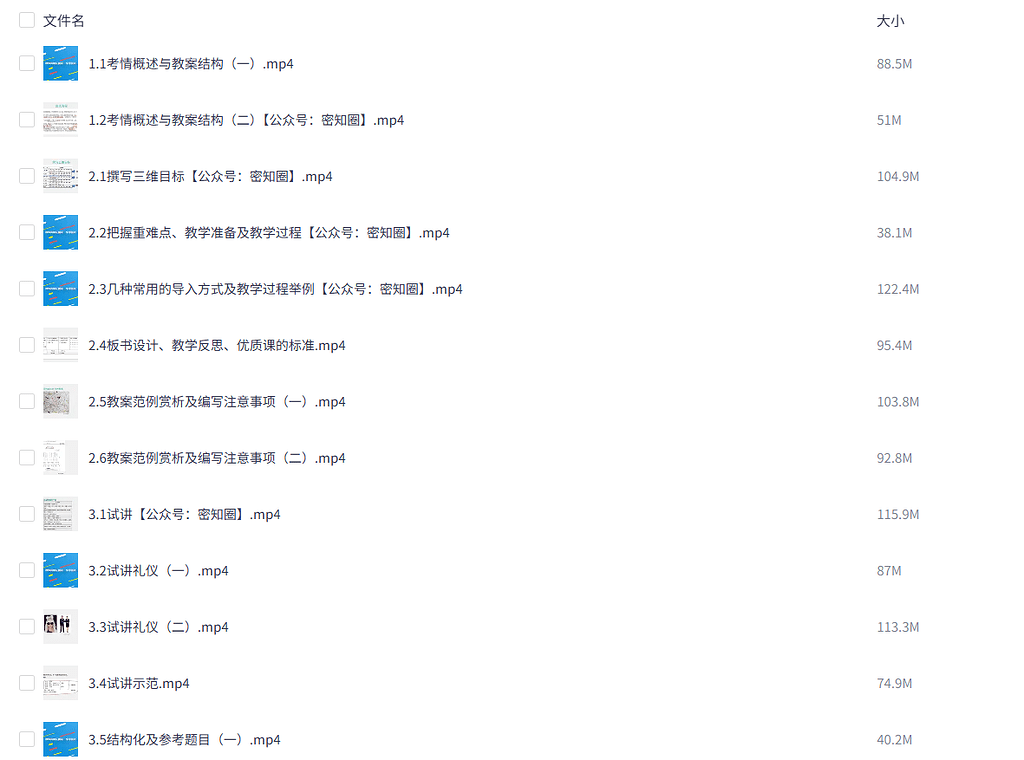 小学教师资格证面试教程(教资) ├── 课程 │ ├── 1.1考情概述与教案结构(一).mp4 │ ├── 1.2考情概述与教案结构(二).mp4 │ ├── 2.1撰写三维目标.mp4 │ ├── 2.2把握重难点、教学准备及教学过程.mp4 │ ├── 2.3几种常用的导入方式及教学过程举例.mp4 │ ├── 2.4板书设计、教学反思、优质课的标准.mp4 │ ├── 2.5教案范例赏析及编写注意事项(一).mp4 │ ├── 2.6教案范例赏析及编写注意事项(二).mp4 │ ├── 3.1试讲.mp4 │ ├── 3.2试讲礼仪(一).mp4 │ ├── 3.3试讲礼仪(二).mp4 │ ├── 3.4试讲示范.mp4 │ ├── 3.5结构化及参考题目(一).mp4 │ ├── 3.6结构化及参考题目(二).mp4 │ ├── 3.7结构化答题赏析.mp4 │ └── 3.8答辩、面试复习.mp4 └── 面试课件 └── 教师资格证面试—小学面试.pdf